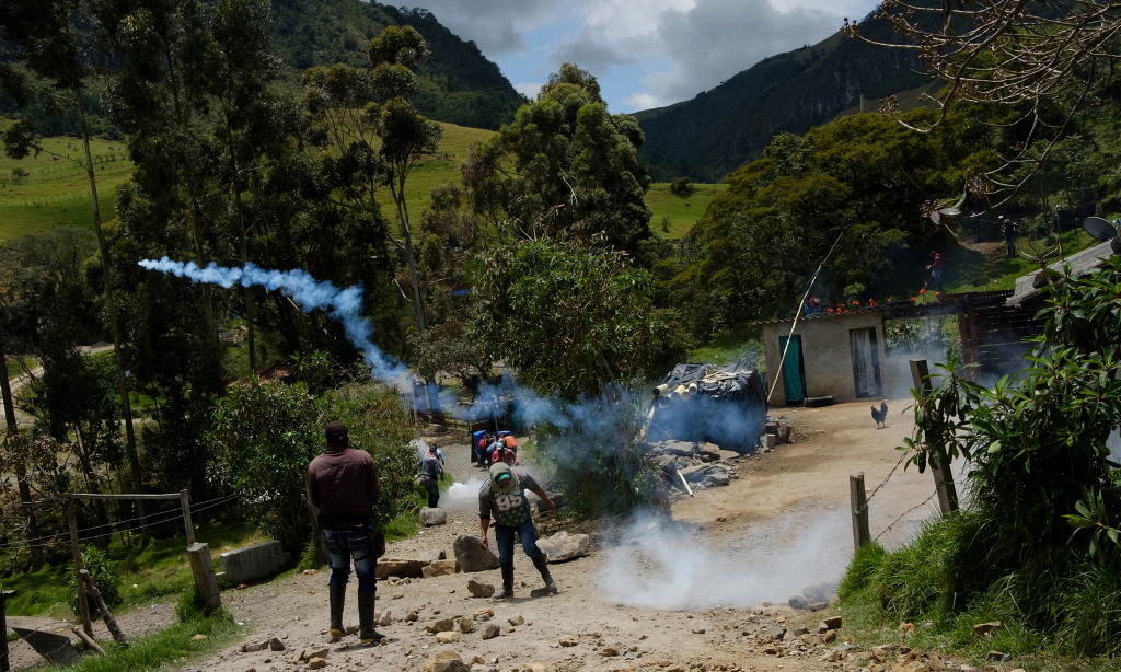 But the peace Vásquez hoped for remains more elusive than ever. After the burial, the Kokonuko crafted shields from plastic barrels sawn in half. Others collected bottles and fuel for petrol bombs. The following morning, the battle for Aguas Tibias recommenced. Several hundred Kokonuko men descended on the beautiful site from all sides of the valley. They were met with volleys of teargas from about 80 riot police camped at the farm who had been fighting off encroachments for four days.