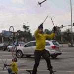Street theatre is difficult and tiring work. The performers have to fit their whole act into the brief minutes of the stoplights’ cycle and leave enough time to hustle for coins.