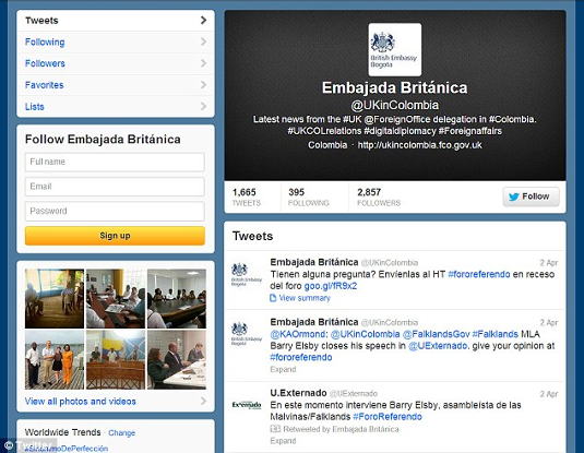 The embassy’s Twitter account, @UKinColombia, repeatedly issued tweets containing the name advertising a debate on the future of the fought-over islands.