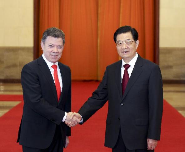 Chinese President Hu Jintao (R) shakes hands with Colombian President Juan Manuel Santos during