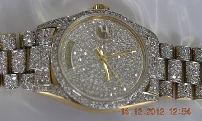 A watch encrusted with diamonds at an auction in Bogota of goods seized from Colombia’s drug traffickers