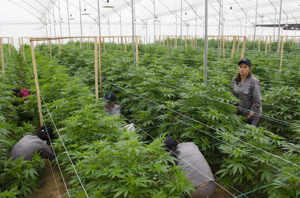 Workers prune marijuana plants at a Clever Leaves greenhouse in Pesca, Colombia. The company employs over 450 people. Photo Clever Leaves