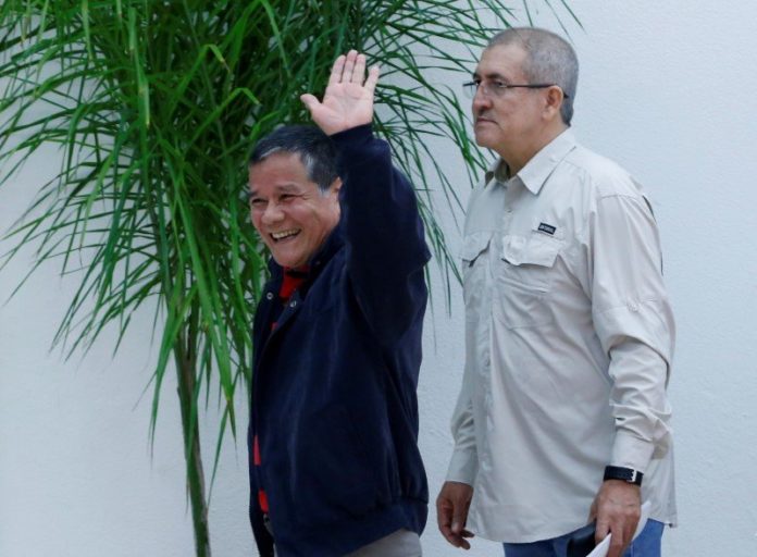 Colombia’s ELN rebel commander, Nicolas Rodriguez waving to the media next to Antonio Garcia, representatives of Colombian National Liberation Army (ELN), ordered a ceasfire