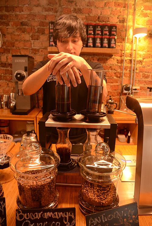 Back in Bogotá, however, coffee snobbery is on full display. Duque prepares the beans with triple-filtered water through an Aeropress, a method akin to the French press that uses a disposable paper filter. The coffee is exceptional.