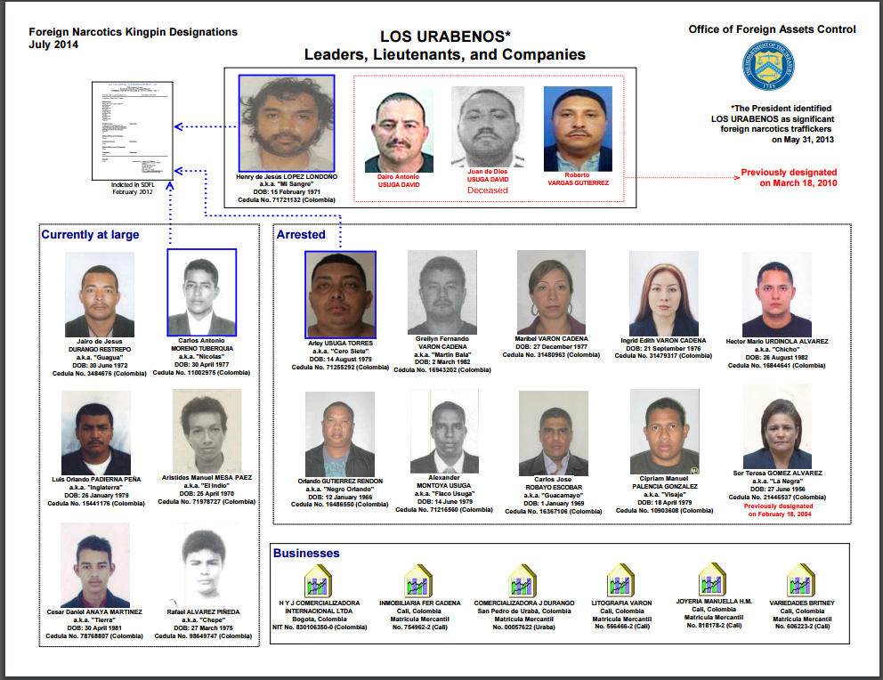 A US federal court in South Florida requested his extradition to face charges of cocaine trafficking to the United States (pdf), and the US Treasury department has accused the Colombian national of being a leading member of the Urabeños drug trafficking organization. (See the Treasury Department’s graphic below)