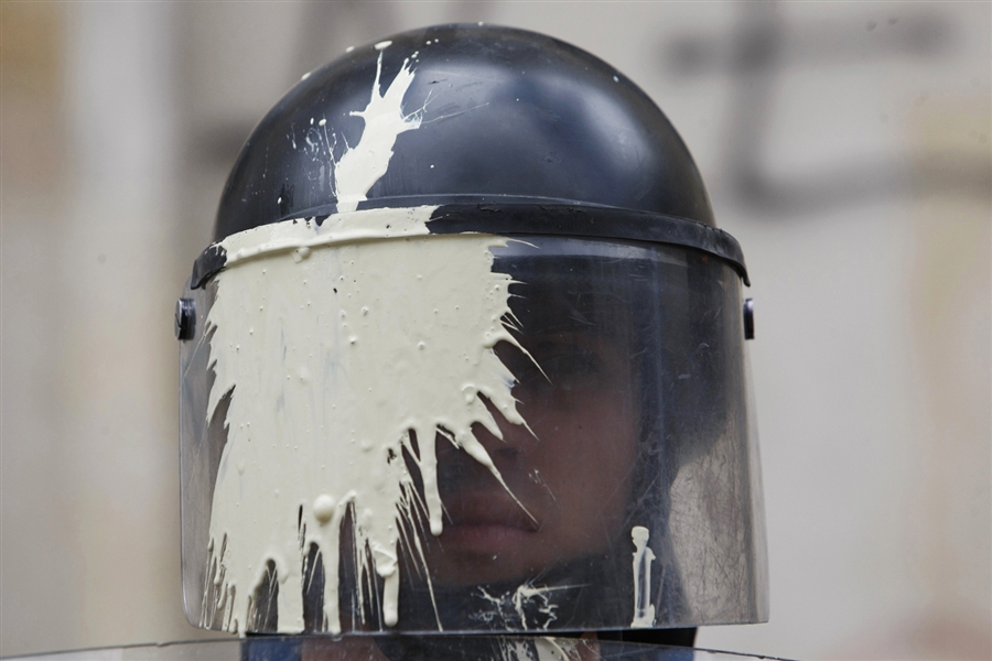 A riot police officer, with a helmet stained by thrown paint, watches a march of teachers and students protesting a wide range of issues regarding the government’s educational policies in Bogota, Colombia.