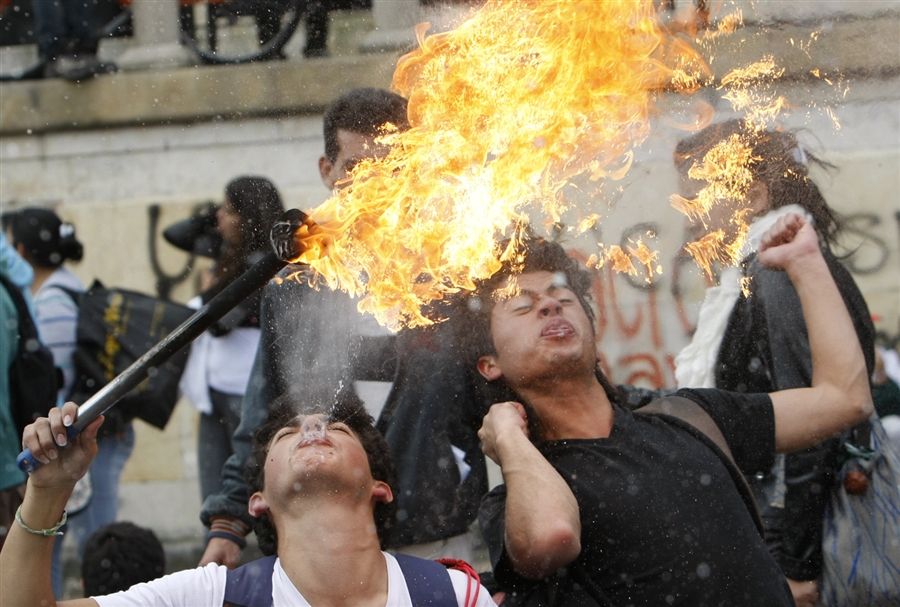 Protesters spit fire during a march by teachers and students in Bogota, Colombia,.