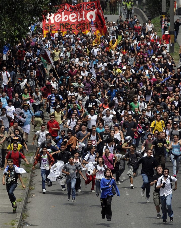 Students wearing costumes face riot police as hundreds of teachers and students march during a protest in Medellin, Colombia, Sept. 5, 2012. Demonstrators were demanding better pay conditions and rejected the privatization of education.