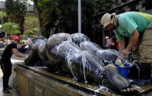 The 23 sculptures by Colombian painter and sculptor Fernando Botero and the plaza where they are displayed in the Colombian city of Medellin underwent a thorough cleaning on the weekend, a task participated in by both public and private institutions.