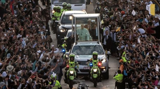 Large enthusiastic crowds have lined the streets of Bogota to catch a glimpse of the pope in his popemobile, chanting and running alongside it.