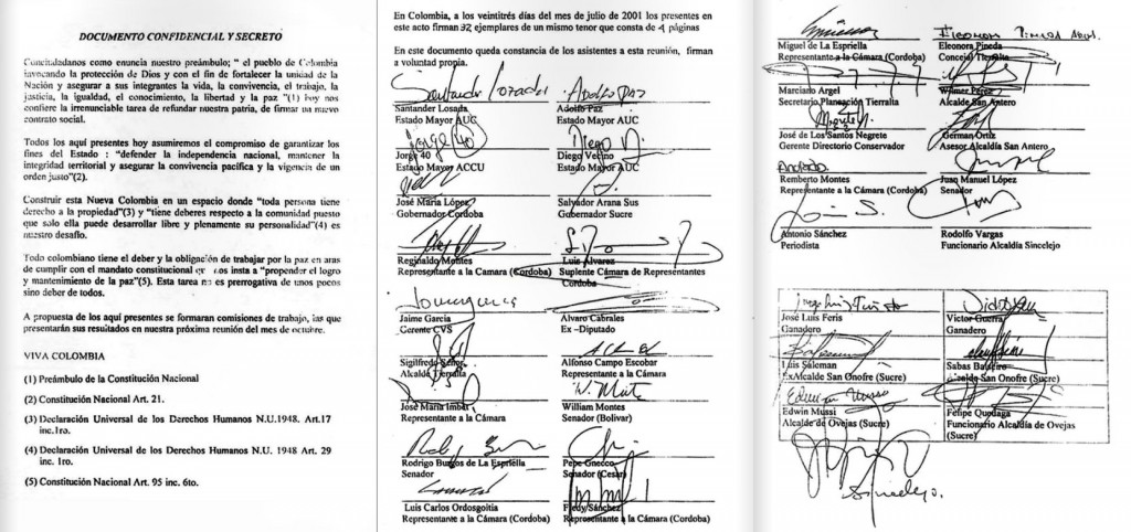 A computer belonging to one of the AUC’s top commanders, “Jorge 40,” provided a copy of the 2001 “Pact of Ralito,” a treaty between paramilitaries and politicians who sought to jointly “construct a New Colombia.”