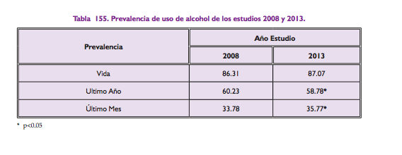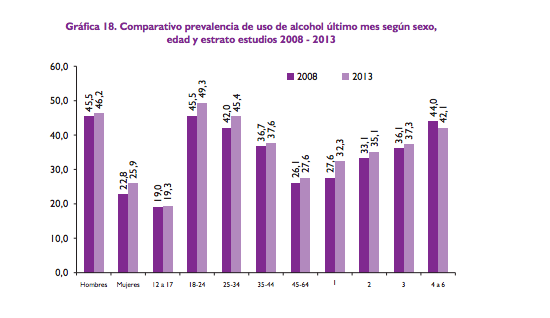 The study also concludes that there is a significant increase from 2008 to 2013 in the use of alcohol in the past month between women, the 18-24 age group, the 25-34 age group, and within the social strata 1 and 2.
