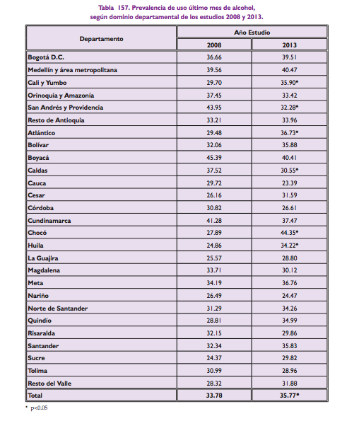 The study, of about 29,000 people from across Colombia, showed that alcohol consumption generally decreased between 2008 and 2013, though between various demographic groups there are increases in consumption.