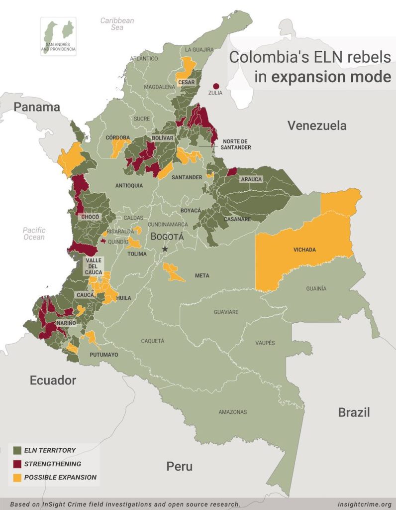 (Insightcrime.org) When Latin America’s oldest insurgency, the FARC, officially becomes a political party, their cousins in the ELN will assume the status of Colombia’s most powerful guerrilla army. But while the ELN are also talking of a peaceful exit, signs on the ground point to a rebel army — and criminal organization — in expansion.