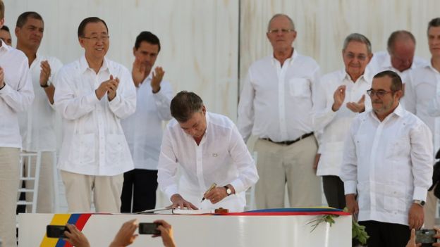 The president and Timochenko used a pen made from a bullet to sign the deal.