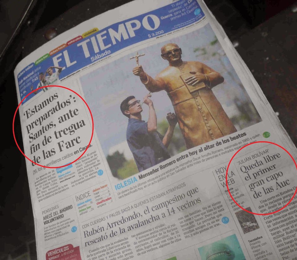 In the lower right corner, the paper reports the release from prison of Julian Bolivar, the first major paramilitary leader to win his freedom after serving the 8-year prison term stipulated by the controversial Law of Peace and Justice.