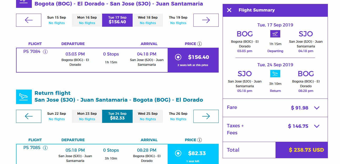 From Bogota, the flight Tuesday, September 17 leaves at 3:03 pm, arriving in San Jose at 4:18 pm; the return flight from San Jose on Tuesday, September 24 leaves Bogota at 5:18 pxpm and arrives in Bogota at 8:28 pm for the fare of US$239. (All times are local).