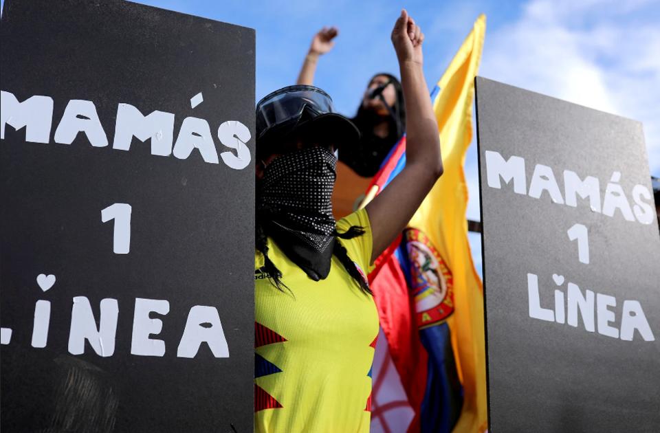 (Reuters) Vanesa protects herself from the hail of tear gas, rocks and fire hose streams that often mark protests in Colombia with just safety glasses, a helmet, a bandanna over her nose and mouth and a flimsy black wooden shield.