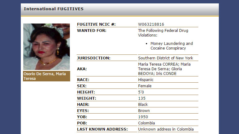 According to the DEA’s most wanted list, the woman is most likely called Maria Teresa Osorio de Serna, but has also gone by the names of Maria Teresa Correa, Gloria Bedoya and Iris Conde.