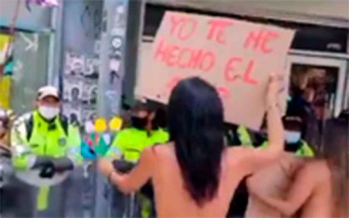 As a gesture to reject the violence reported mostly by women, several women met in the Parque Nacional, in Bogota, totally naked in front of the police officers and raised signs with phrases such as “Yo soy tu amante”, “Yo soy tu hija”, “Me has hecho el amor”, “Yo te he hecho el amor” and “Mi útero fue tu primer hogar” (I am your lover, I am your daughter, You have made love to me, I have made love to you, and My uterus was your first home).