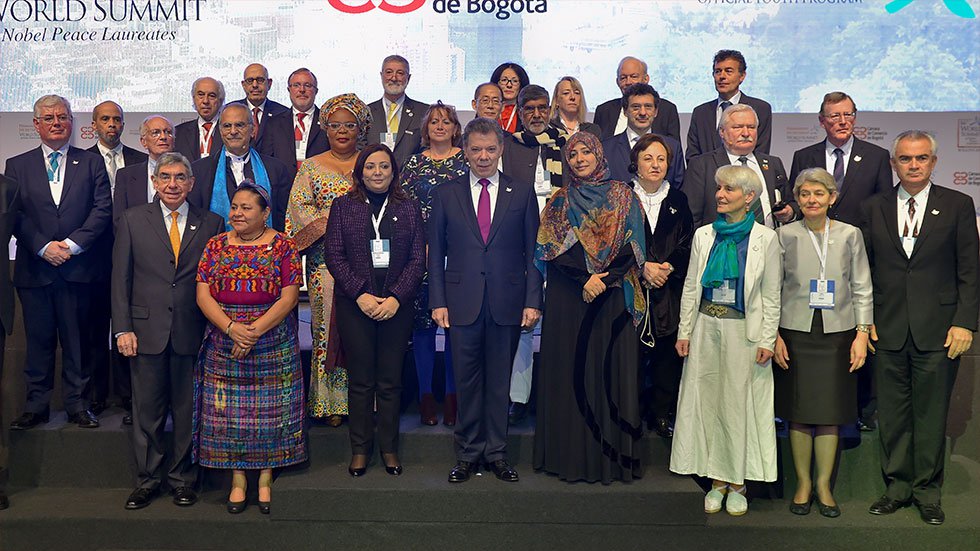The Nobel Peace Prize laureates were in Colombia’s capital Bogota to visit Colombian President Juan Manuel Santos, who last year won the prize for his successful attempt to barter an end to 52 years of armed conflict with the FARC, the country’s largest and oldest illegal armed group.