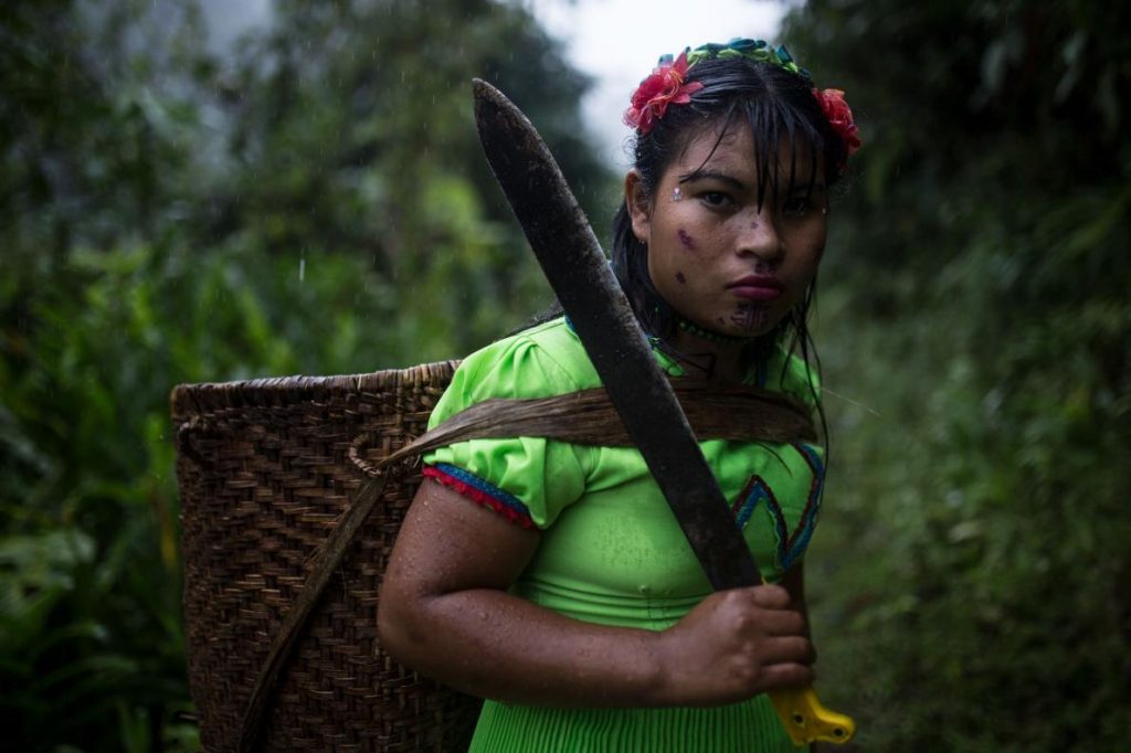 Carrying a machete and food basket, an Emberá Katío woman levels a penetrating gaze at the photographer. The villagers of La Puria follow traditional subsistence, hunting game and practicing small-scale horticulture. Photograph by Iván Valencia