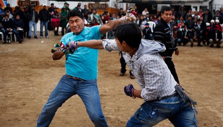 [quote]Takanakuy (“when the blood is boiling” in the Quechua language) is an annual established practice of fighting fellow community members held on 25 December, by the inhabitants of Chumbivilcas Province, near Cuzco in Peru. The practice started in Santo Tomás, the capital of Chumbivilcas and has now spread to other villages and cities, the prominent ones being Cuzco and Lima. The festival consists of dancing and of individuals fighting each other to settle old conflicts or simply to display their manhood.[/quote]