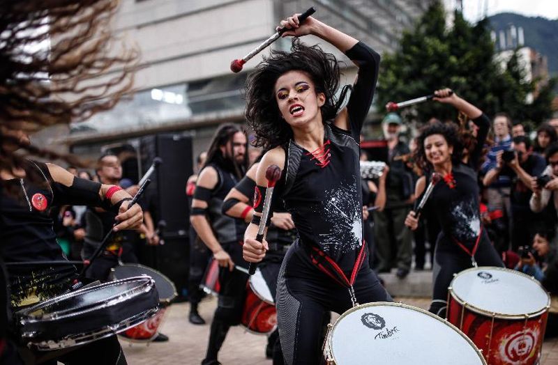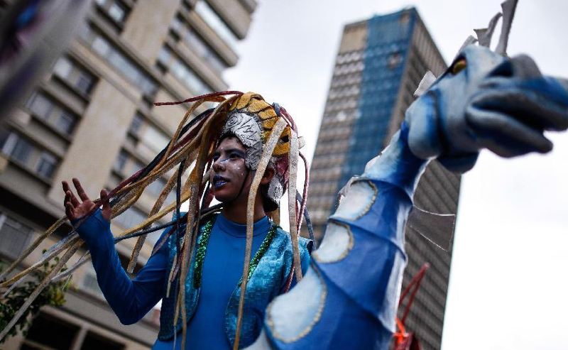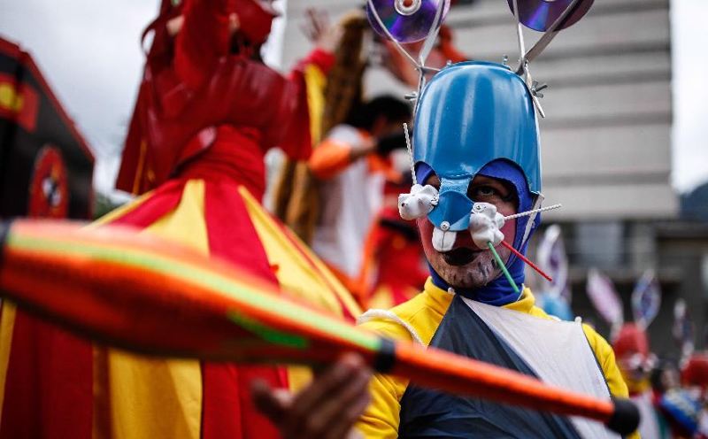 Artists take part during the launching of the street theater in the framework of the 14th Ibero-American Theater Festival of Bogota (FITB, for its acronym in Spanish), in the city of Bogota, Colombia, on March 19, 2014.