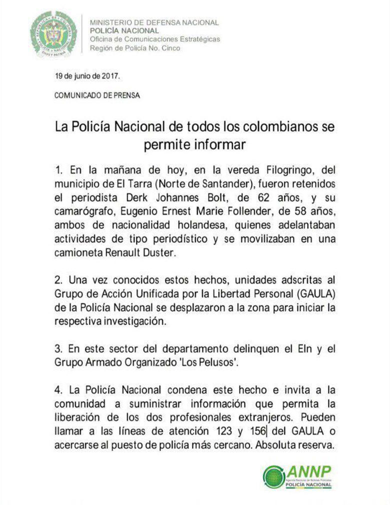 “We have established that members of the Frente Hector of the ELN appear to have kidnapped the journalists,” the statement said.
