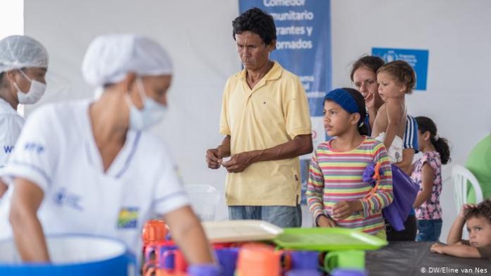 Venezuelan migrants wait in line to have their registration number and details checked before receiving their lunch. The UN’s World Food Program serves food three times a day.