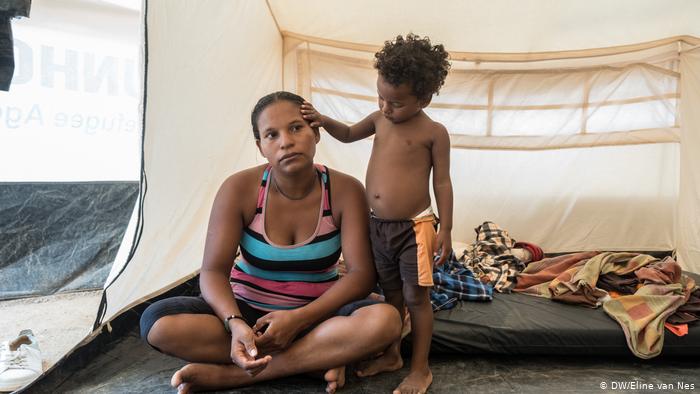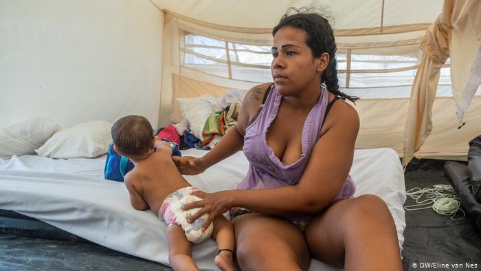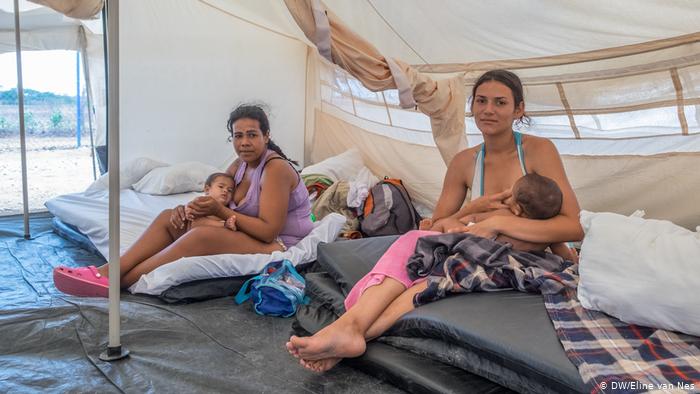 Rosmery Castillo (34, left) and Vanesa Añez Añez (19) did not know each other when they both arrived at the UNHCR reception center at the same time. They were placed in a tent to share.