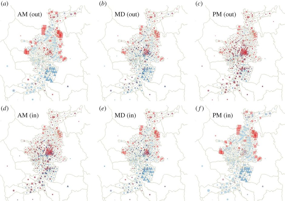 Geographical location of origin (out, (a–c)) and destination (in, (d–f)) nodes of the trips performed during each time slot (AM left, MD middle, PM right) by the individuals of three socio-economic classes, namely 1 (poorest, red squares), 3 (low middle class, light blue circles) and 6 (richest, dark blue triangles). (Royal Society Open Science)