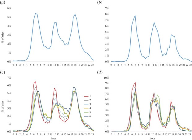 Percentage of trips as a function of time during a week day. Time is discretized in intervals of 30 min. Left panels (a) and (c) correspond to the city of Medellín, while right panels (b) and (d) correspond to Manizales. Lower panels show separately this percentage for each socio-economic class, and upper panels do that for the whole population. (Royal Society Open Science)